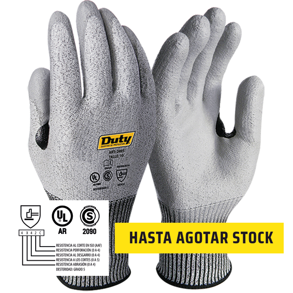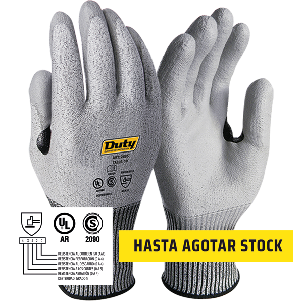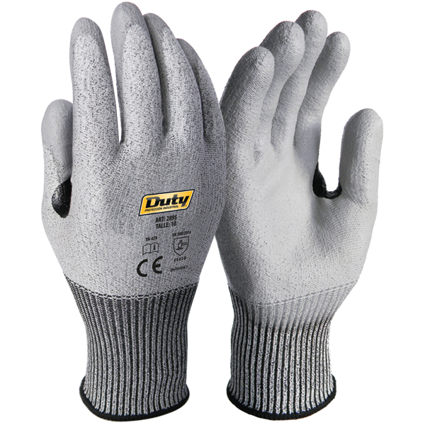 Guante de corte Nivel 5 Soporte textil en HPPE, con baño de PU (poliuretano) en palma y dedos, con refuerzo en Nitrilo suave entre índice y pulgar.